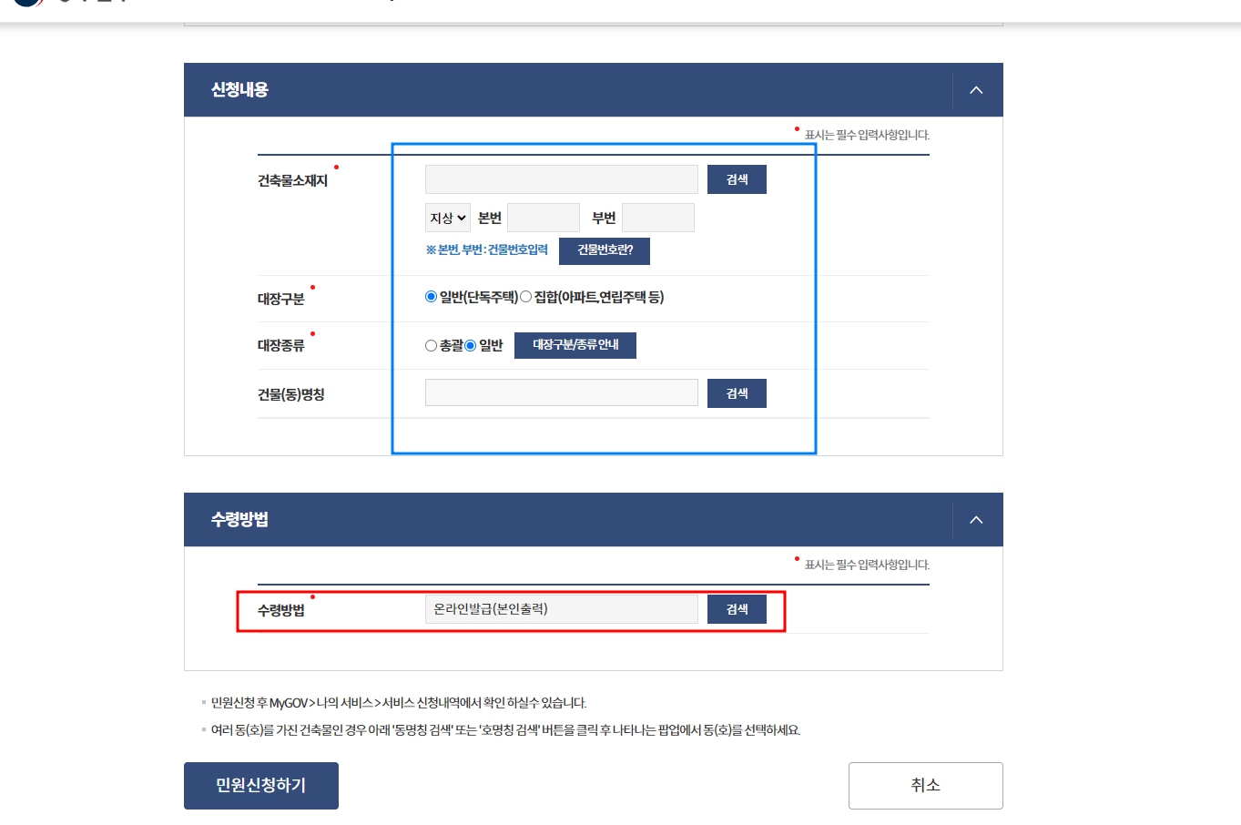 5. 건축물 소재지 입력하기고 민원신청하기를 누르시면 됩니다. 그리고 수령방법은 온라인발급(본인출력)으로 하시고 신청하시면 발급이 됩니다.