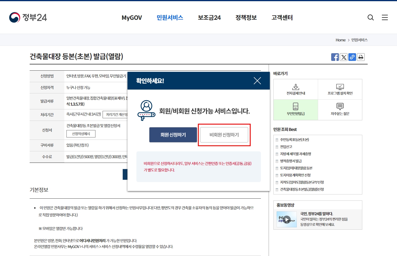 3. 비회원 신청하기를 누르시면 아래와 같은 화면이 나옵니다.