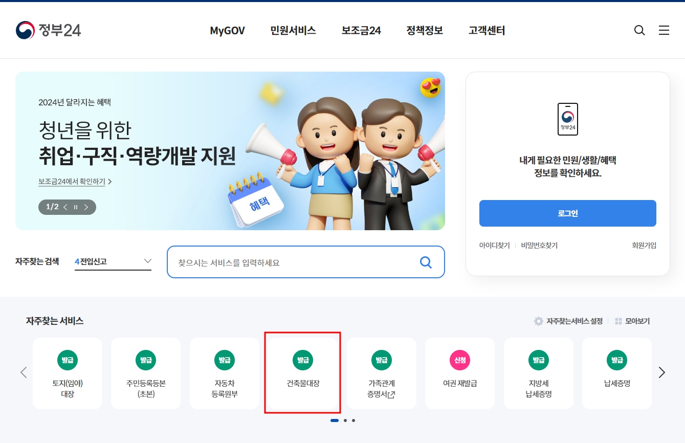 1. 정부24 홈피이제 접속하여 로그인을 한다.