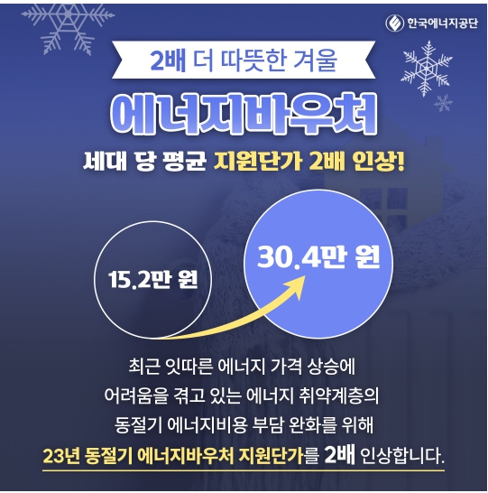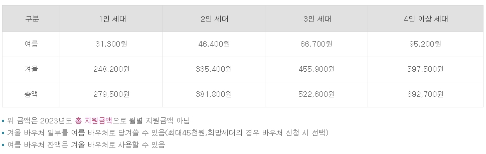 2023년 정부는 에너지 바우처 지원금액을 대폭 상승하여 이전보다 2배 가까지 상승했으며, 에너지 바우처 지원금액은 가구원 수에 따라 달라지며, 아래와 같이 지원됩니다.
