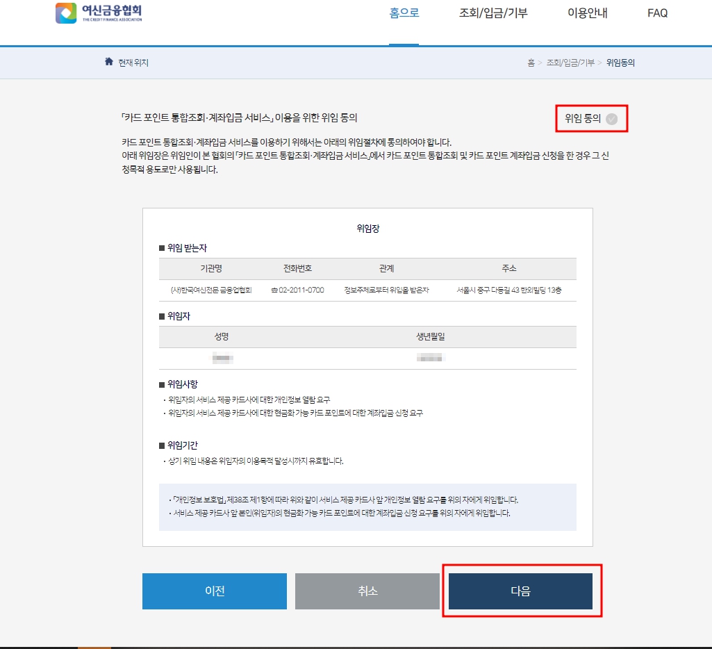 3. 로그인 절차가 마무리 되면 위임장이란 화면이 나옵니다. 동의하시고 진행하시면 됩니다.