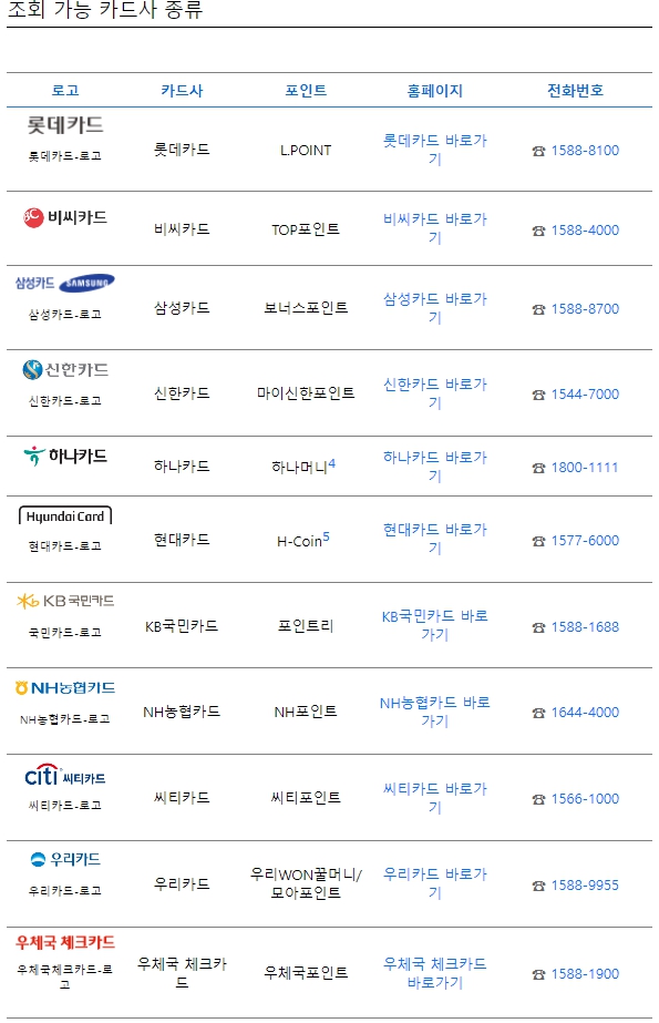 1. 본 카드포인트 통합조회 시스템은 조회 가능한 카드사 종류가 정해져 있습니다. 내가 보유한 카드가 조회가능한지 확인해 보세요.